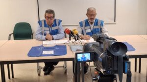 En la rueda de prensa llevada a cabo hoy en las instalaciones de Lavadores, el presidente y el secretario del Banco de Alimentos de Vigo, José Ramón Santamaría y Eusebio Garre, respectivamente, hicieron un llamamiento para enfundarse el peto azul durante el fin de semana más solidario del año.